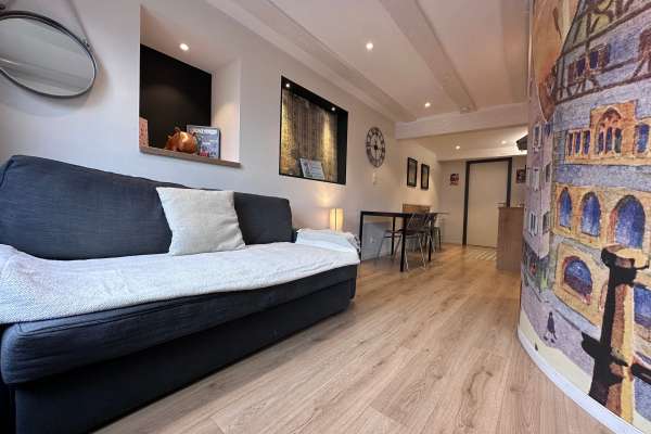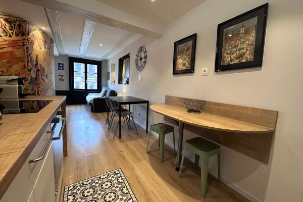 L’appartement tout équipé se situe au 1er étage (sans ascenseur) d’un petit immeuble. Il est composé d’une cuisine équipée moderne (four, plaque de cuisson, hotte, réfrigérateur, four micro-ondes, machine à café NESPRESSO, bouilloire et tout le nécessaire pour cuisiner comme à la maison) ouverte sur le salon/séjour avec espace repas, espace détente (canapé et télévision) et petite espace travail (bureau)