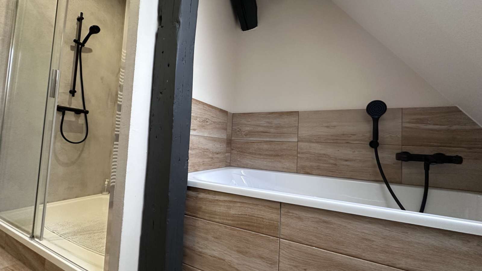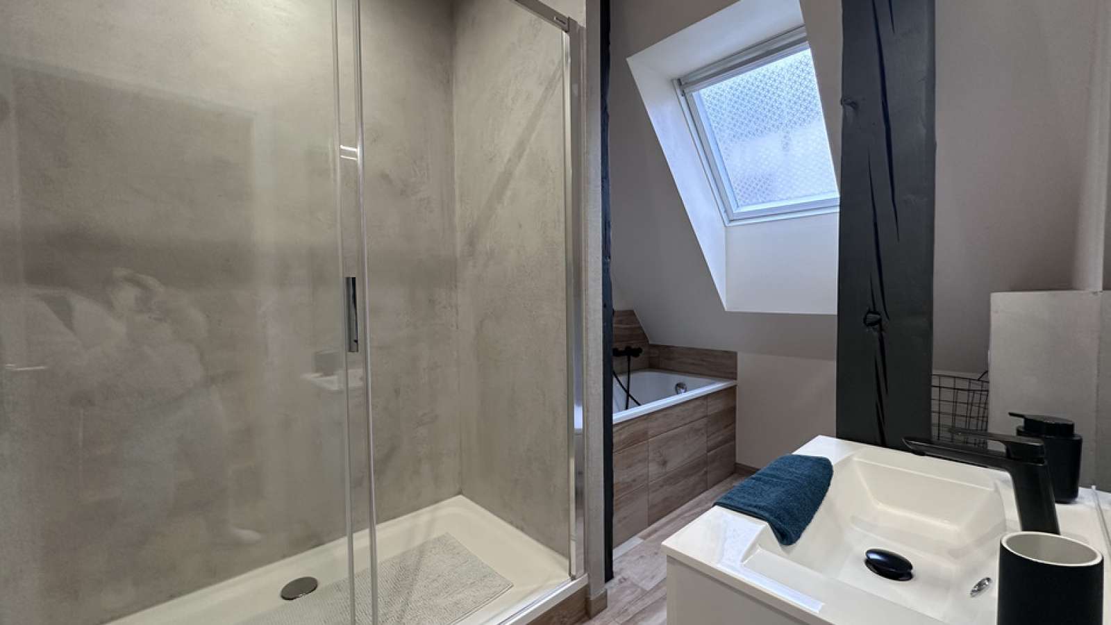 L’appartement tout équipé se situe au 3ème et dernier étage (sans ascenseur) d’un petit immeuble, il est composé au premier niveau : d’une cuisine équipée moderne (four, plaque de cuisson, hotte, réfrigérateur, four micro-ondes, machine à café NESPRESSO, bouilloire et tout le nécessaire pour cuisiner comme à la maison) ouverte sur le salon/séjour avec espace repas, espace détente (canapé et télévision) et petit espace travail (bureau). Vous trouverez 2 salles d’eau avec chacune une douche et une avec baignoire, un meuble vasque et un sèche serviettes.