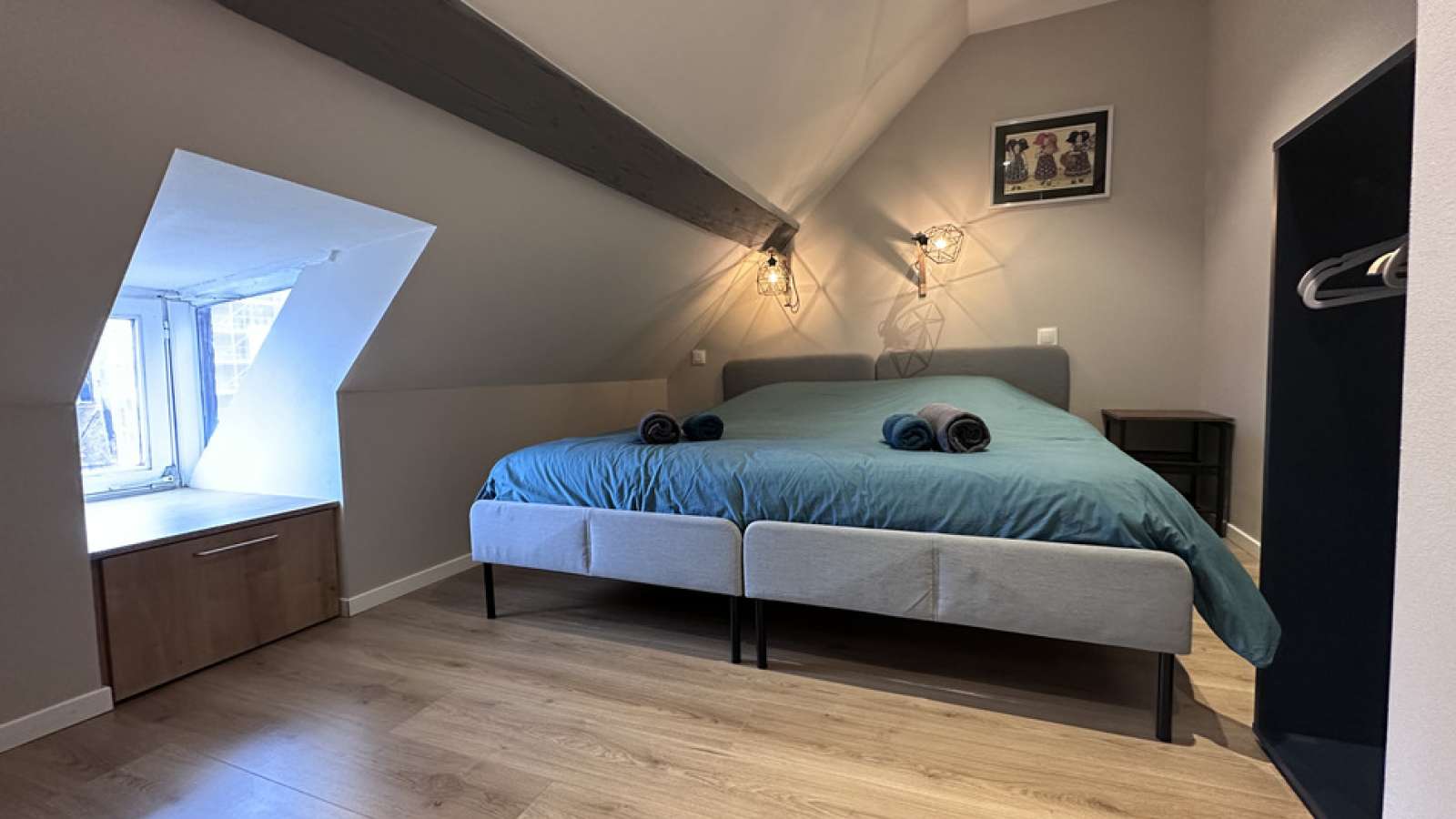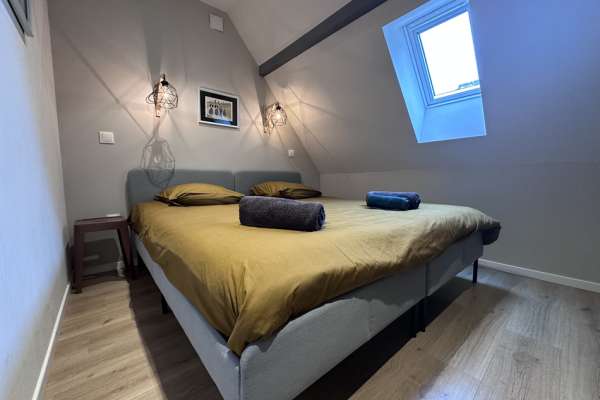 A l’étage : 2 chambres avec lits King size (180x200) et armoire de rangement.