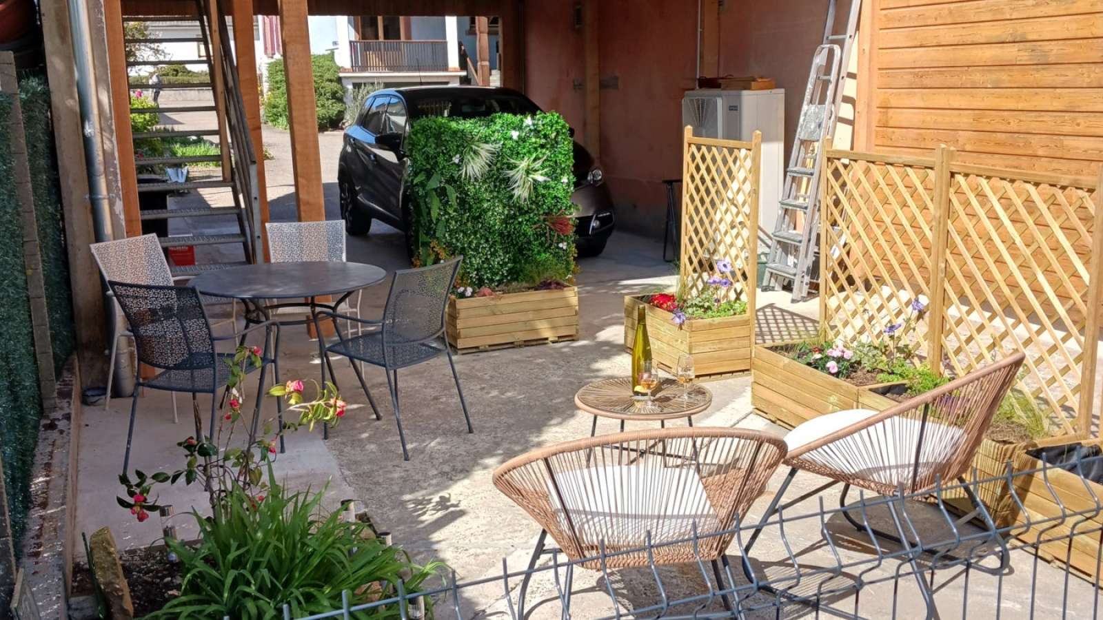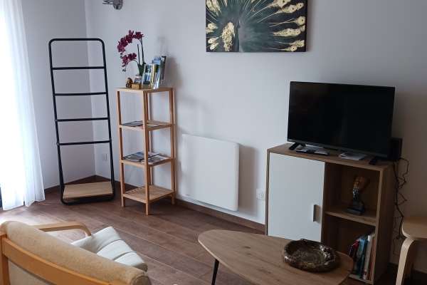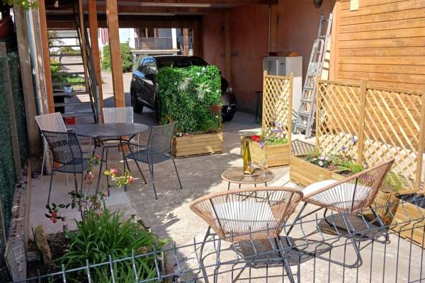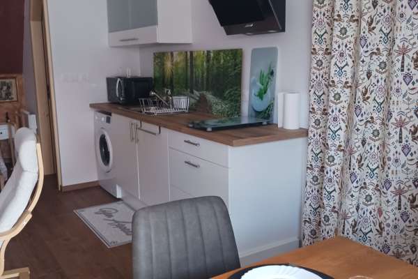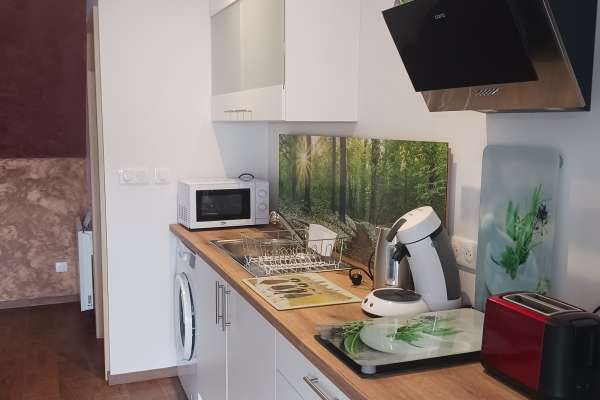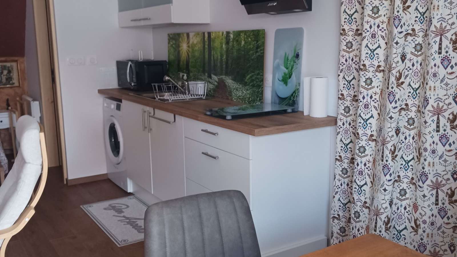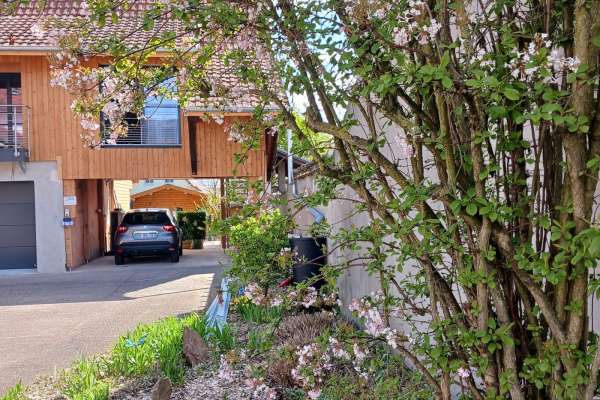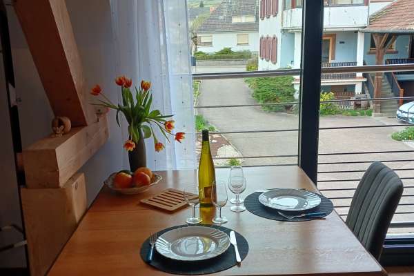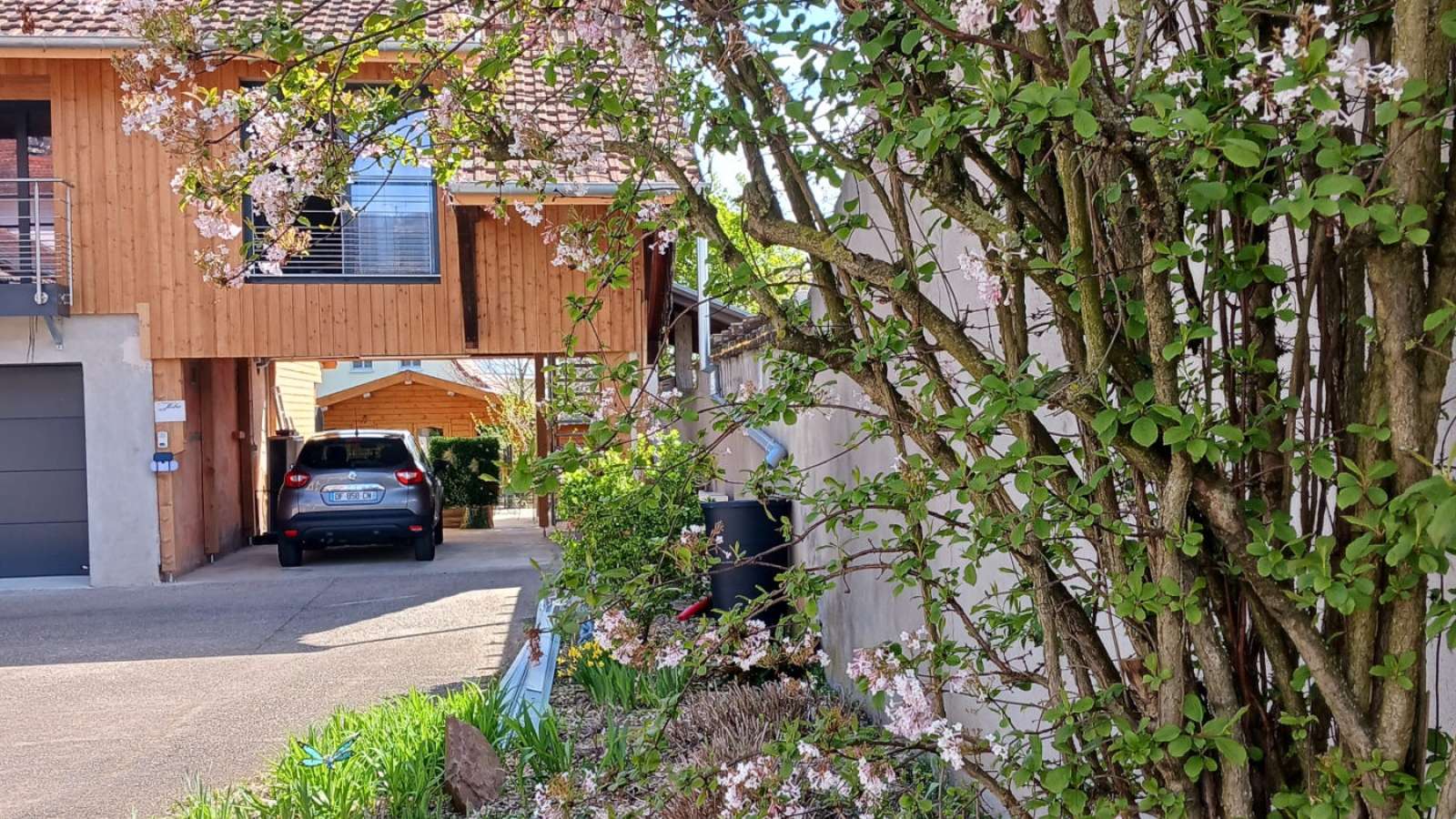Studio meublé neuf, 1 à 2 personnes, 28 m², au 1er étage, près du centre ville; cuisine équipée, coin télé et table à manger, salle de bains avec WC, grand lit tout confort, machine à laver le linge, télé, wifi gratuit, recharge électrique voiture. Espace extérieur privé au calme, de 18m2 au rez de chaussée pour détente et repas. Parking couvert pour la voiture et local fermé pour les vélos. Vue dégagée sur les Vosges.