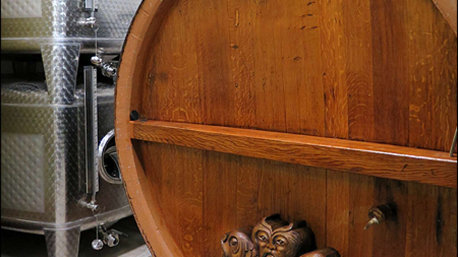 Dans la cave, le bois de très anciens foudres voisine avec la rutilance high tech des cuves inox.