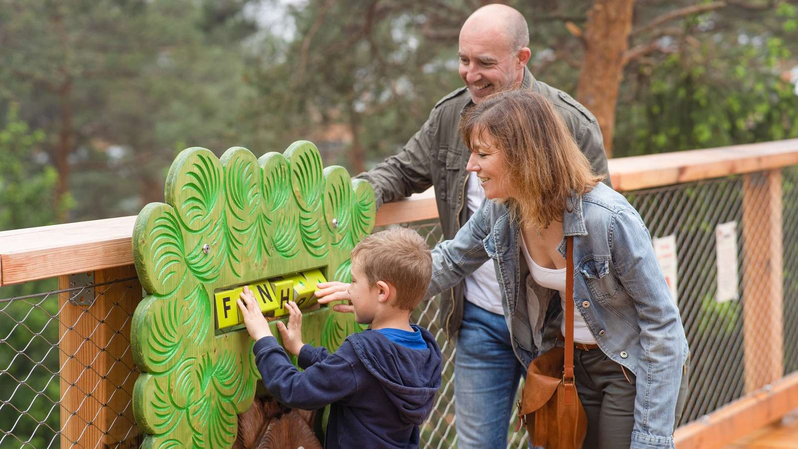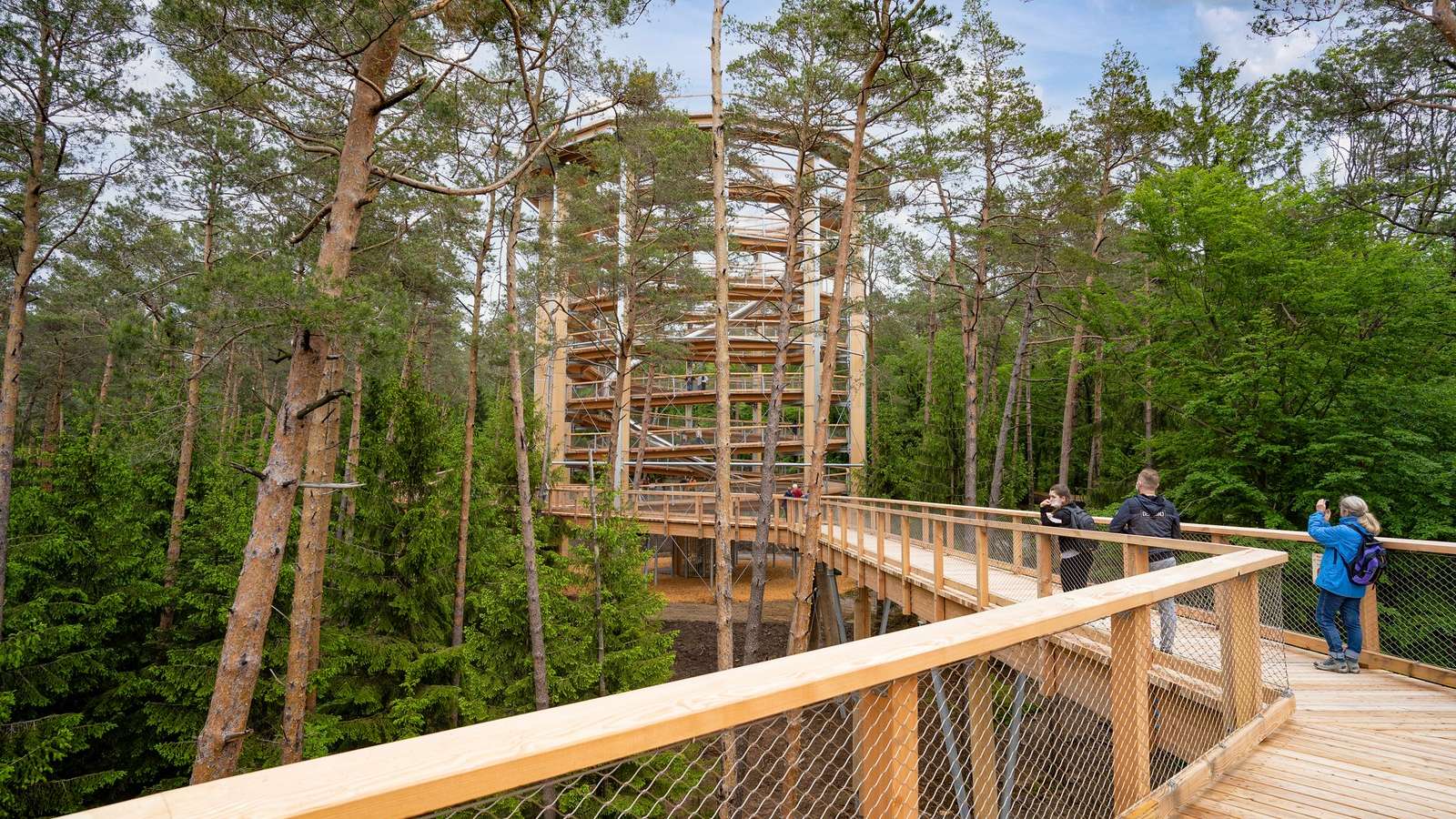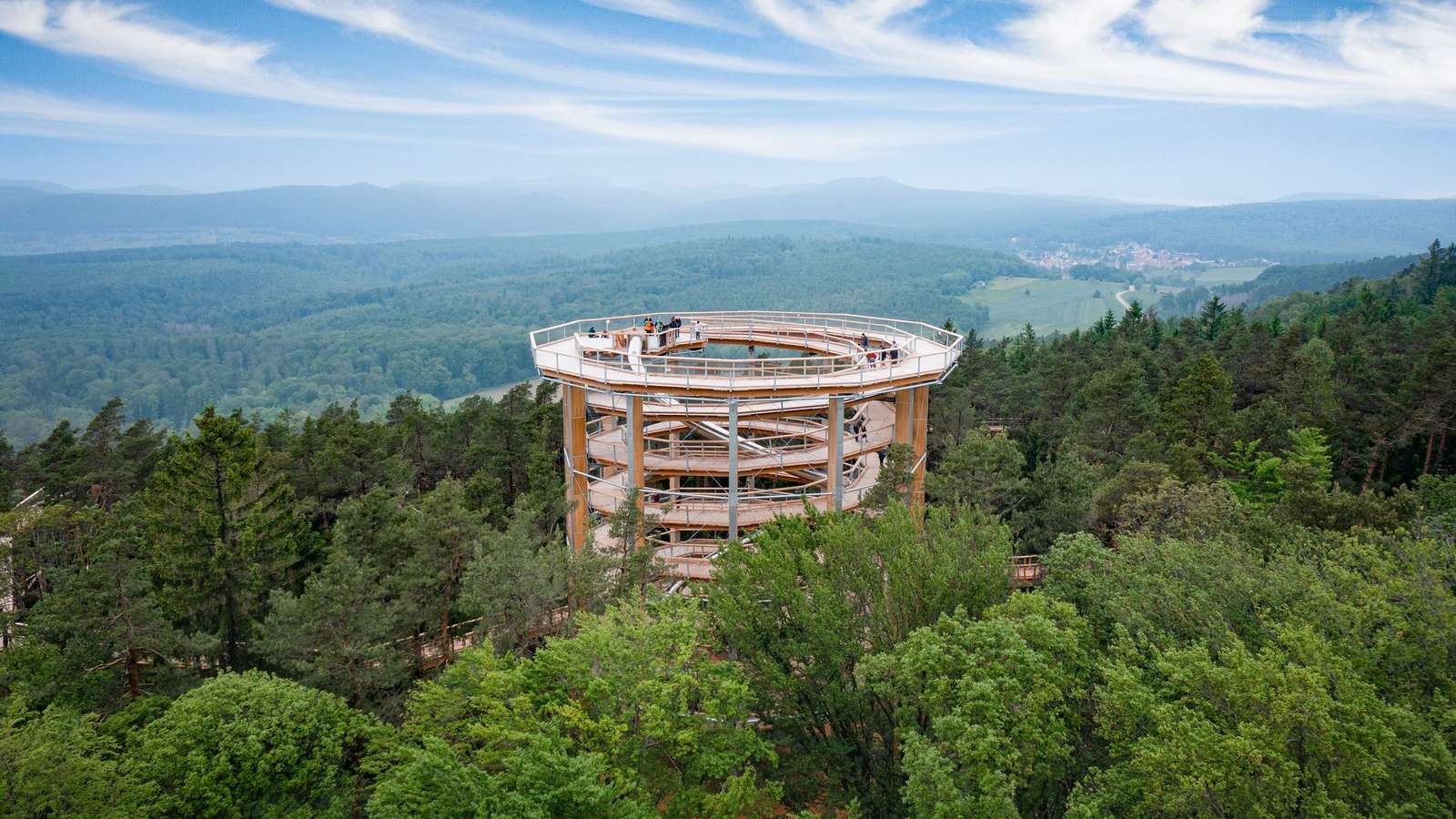 D'une longueur totale de 1 050 mètres et avec une pente maximale de 6%, le Chemin des Cimes vous emmènera progressivement au-dessus de la cime des arbres, jusqu'au sommet de la tour panoramique de 29 mètres. Parmi les points les plus élevés des environs, celle-ci offrira un panorama à 360° sur les Vosges du Nord, la plaine du Rhin et la Forêt-Noire. Des stations de découvertes en chemin et un toboggan de 75 mètres à l'intérieur de la tour rendront votre expérience encore plus amusante !