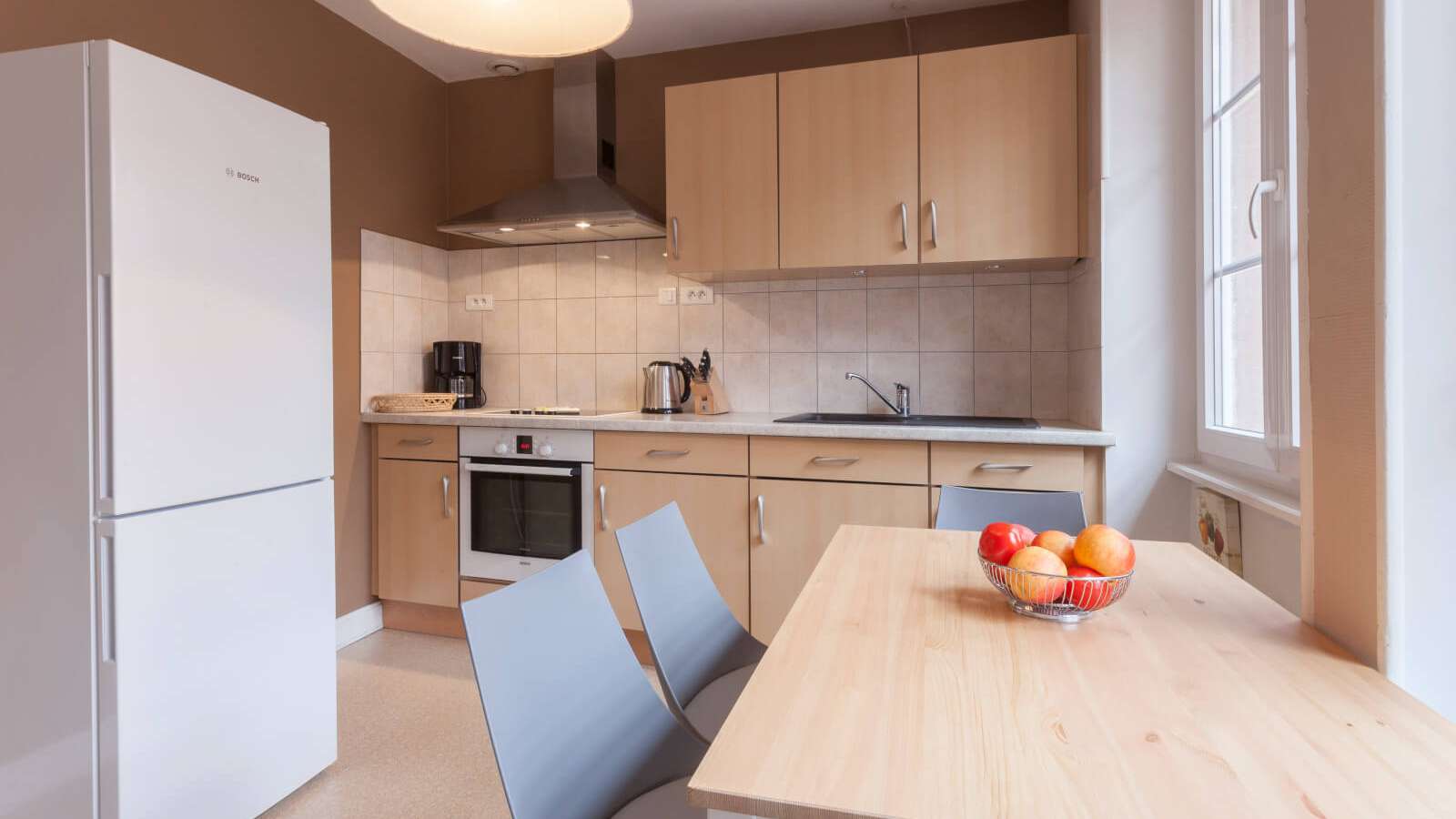 - D'une cuisine équipée (congélateur/réfrigérateur, four électrique classique avec 4 plaques induction, machine à café, micro onde, grille pain).