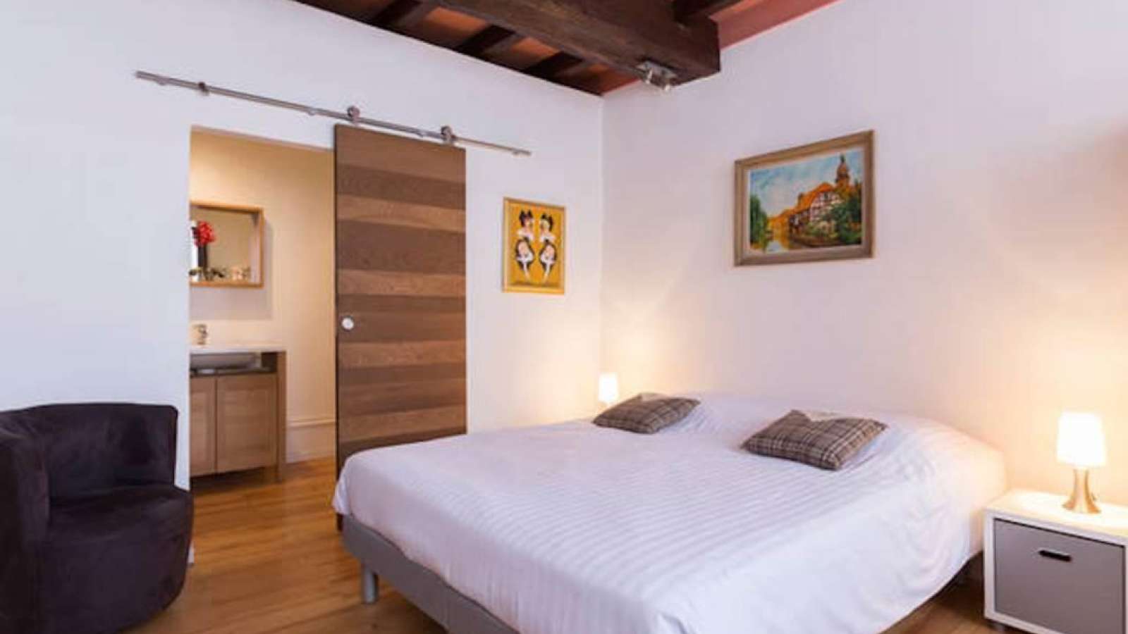 "La Chambre de Bartholdi" classée meublé de tourisme 4* est un studio de 15 m2 pour 2 personnes, situé au rez-de-chaussée d’une maison alsacienne en plein cœur du quartier historique de Colmar. Ce charmant logement est équipé d’un coin cuisine équipée : (réfrigérateur, four, plaque induction, bouilloire, machine Nespresso) et repas, d’un lit double de 160*200, d’une salle d'eau séparée avec douche à l'italienne et wc, d’une télévision à écran plat et d’un accès à internet wifi gratuit.