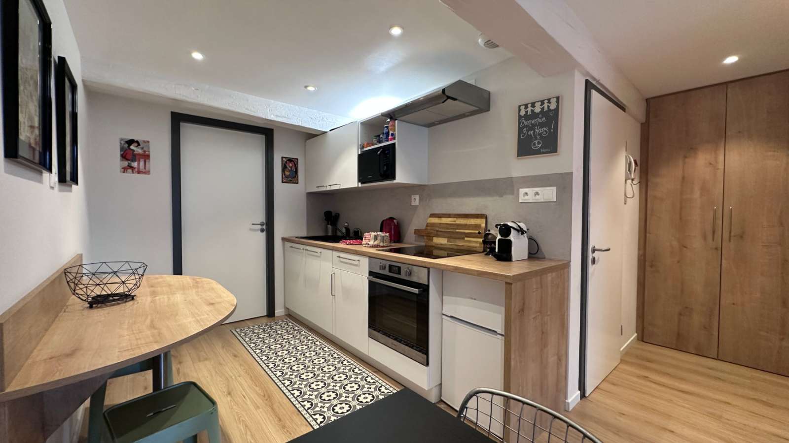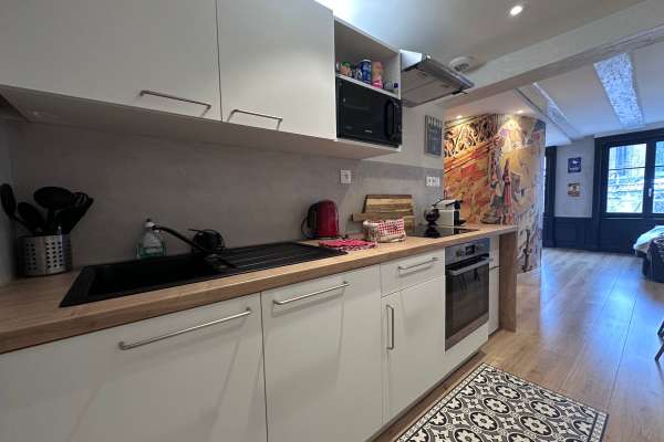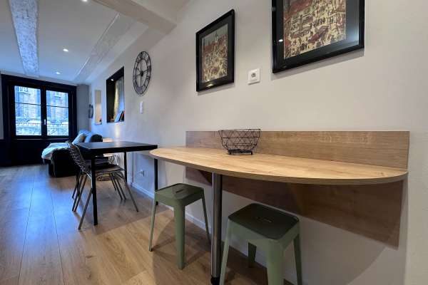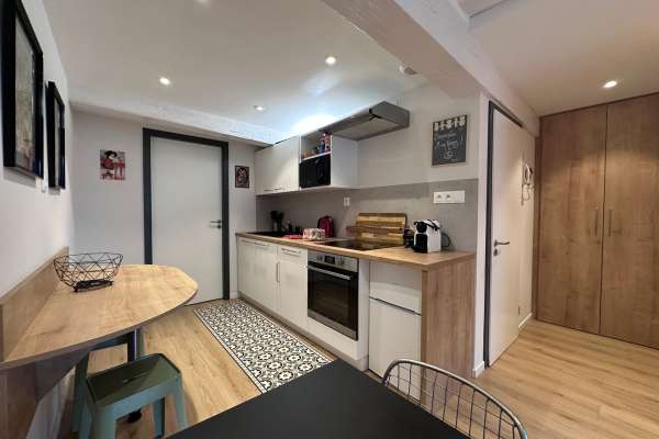 L’appartement tout équipé se situe au 1er étage (sans ascenseur) d’un petit immeuble. Il est composé d’une cuisine équipée moderne (four, plaque de cuisson, hotte, réfrigérateur, four micro-ondes, machine à café NESPRESSO, bouilloire et tout le nécessaire pour cuisiner comme à la maison) ouverte sur le salon/séjour avec espace repas, espace détente (canapé et télévision) et petite espace travail (bureau)
