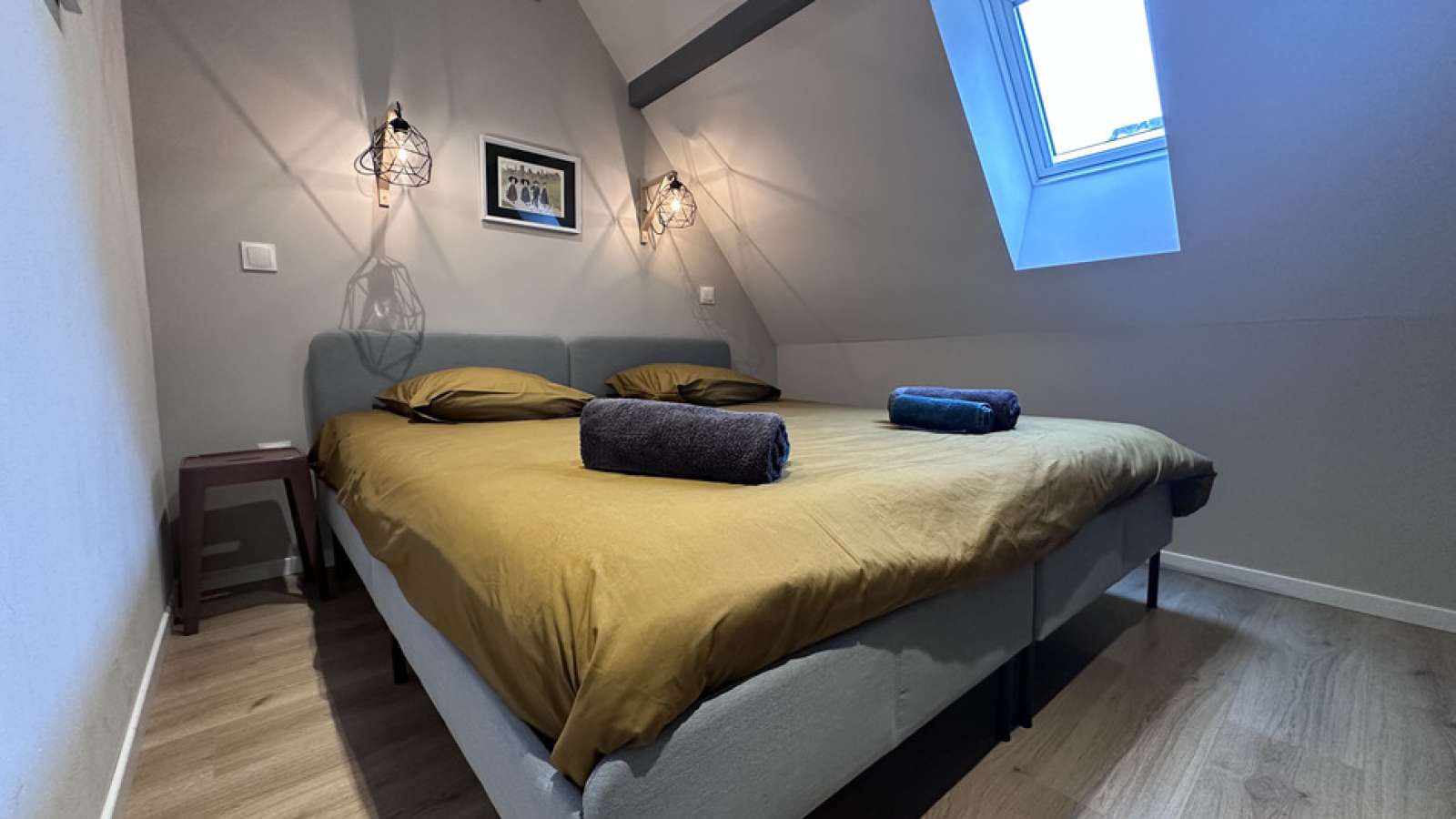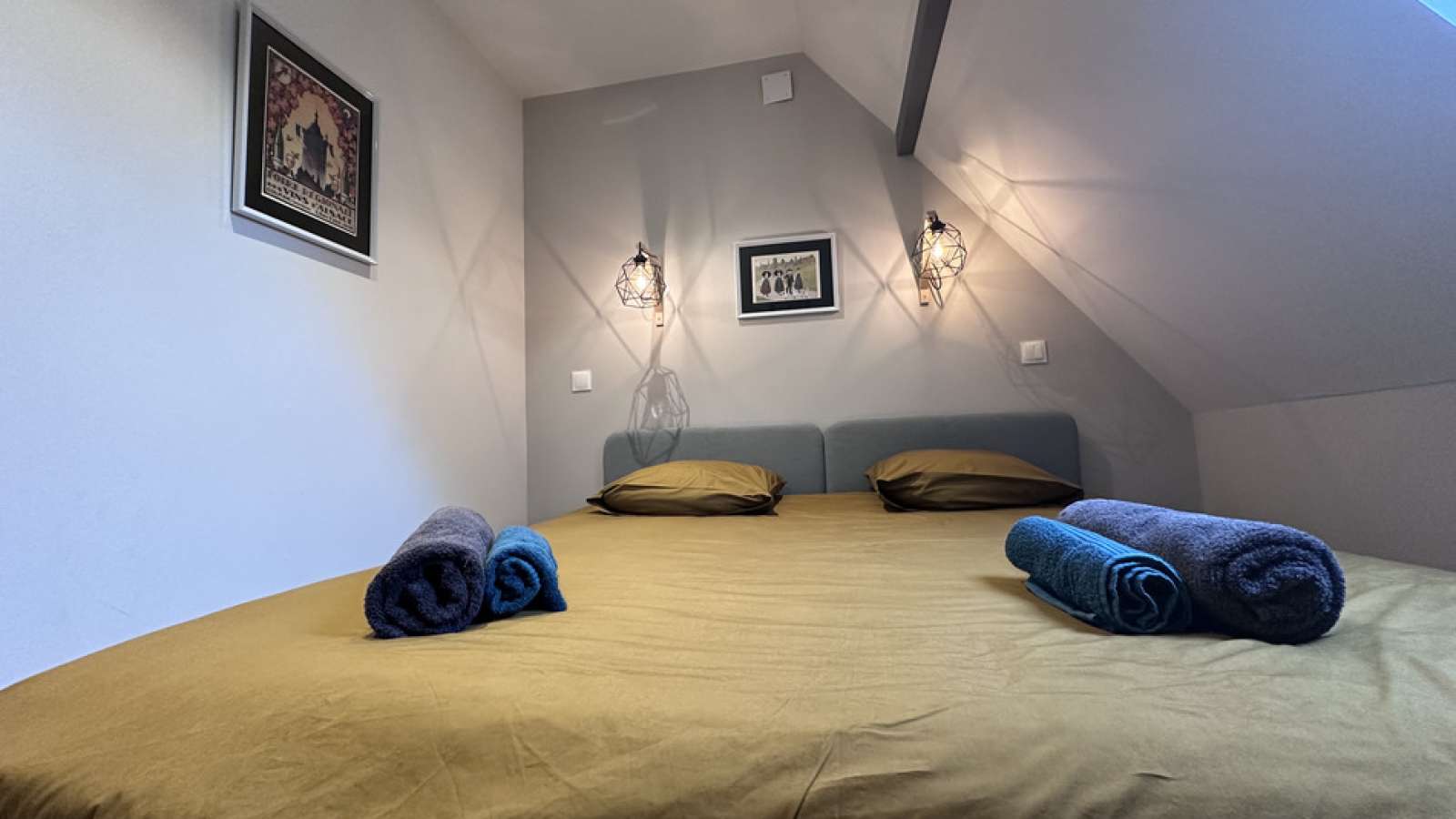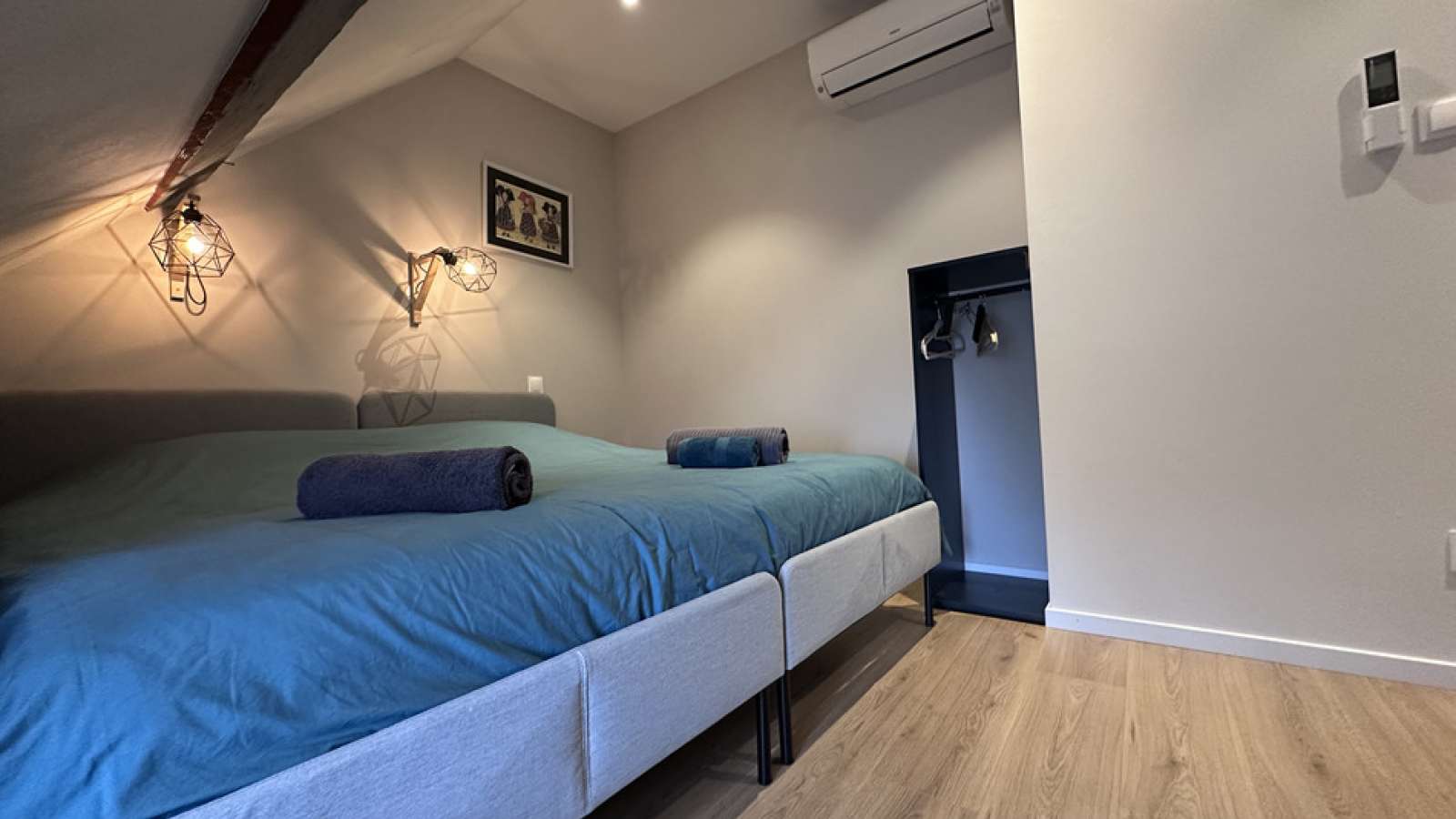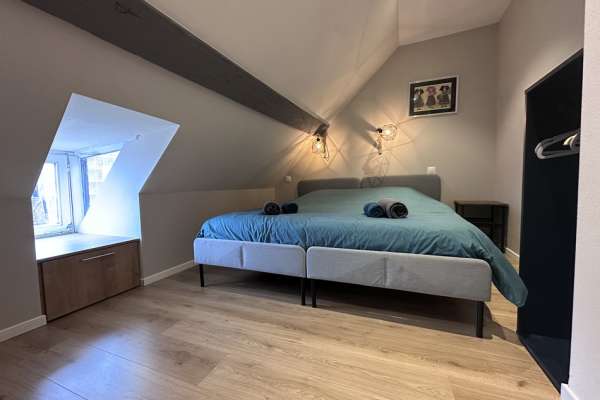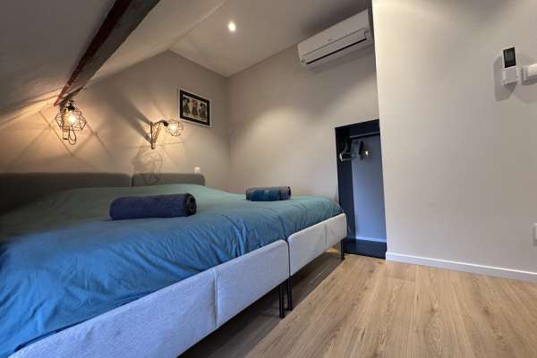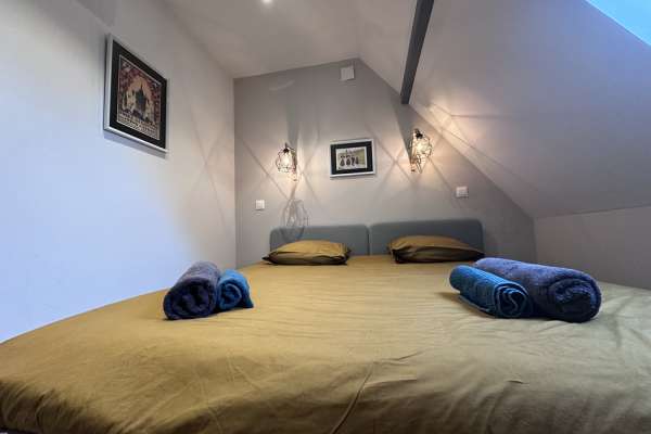 A l’étage : 2 chambres avec lits King size (180x200) et armoire de rangement.