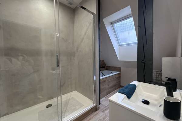 L’appartement tout équipé se situe au 3ème et dernier étage (sans ascenseur) d’un petit immeuble, il est composé au premier niveau : d’une cuisine équipée moderne (four, plaque de cuisson, hotte, réfrigérateur, four micro-ondes, machine à café NESPRESSO, bouilloire et tout le nécessaire pour cuisiner comme à la maison) ouverte sur le salon/séjour avec espace repas, espace détente (canapé et télévision) et petit espace travail (bureau). Vous trouverez 2 salles d’eau avec chacune une douche et une avec baignoire, un meuble vasque et un sèche serviettes.