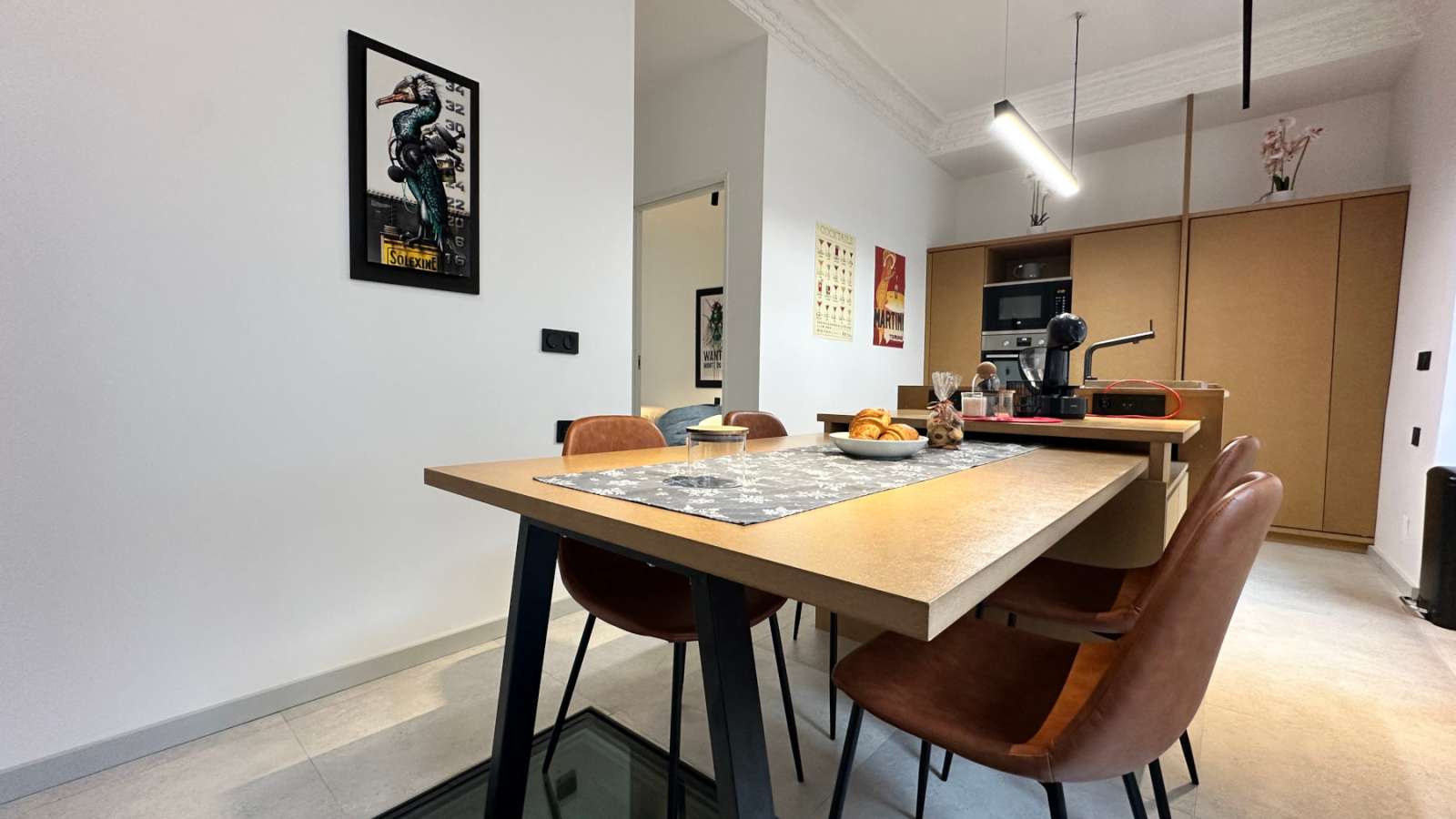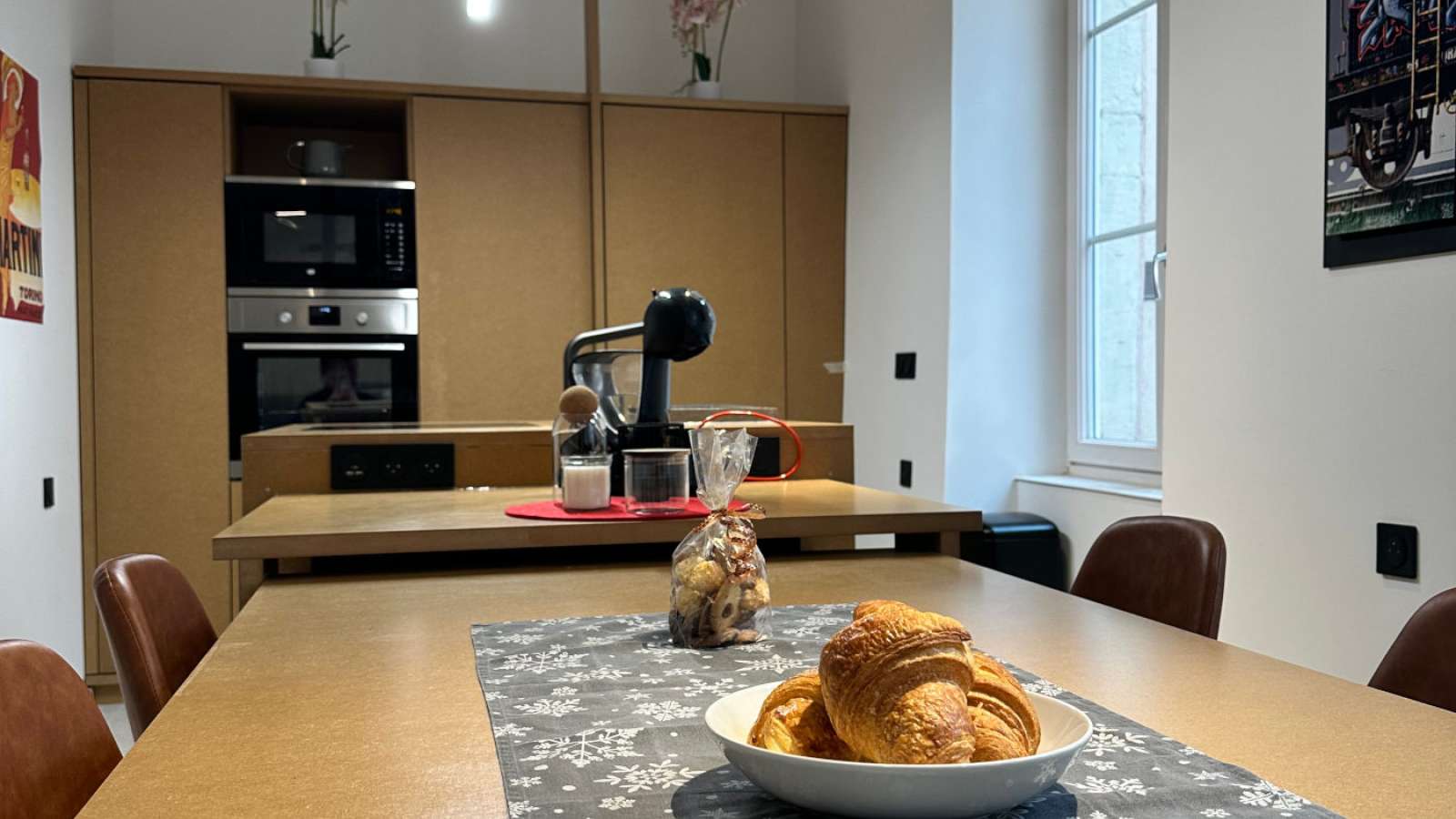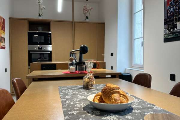 Il est composé d'une cuisine moderne toute équipée (four, plaque de cuisson, hotte, lave-vaisselle, réfrigérateur/congélateur, machine à café DOLCE GUSTO, bouilloire et tout le nécessaire pour cuisiner comme à la maison), ouverte sur le salon/séjour avec espace repas modulable, espace détente (canapé 2 places et fauteuils, télévision). Plusieurs jeux de société ainsi qu'une Super Nintendo sont à votre disposition pour animer vos soirées d'hiver !