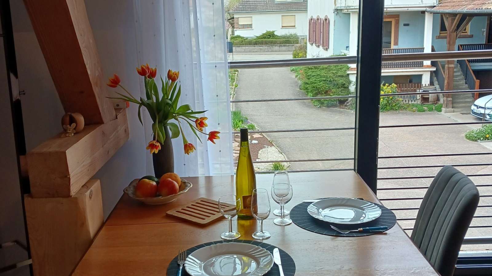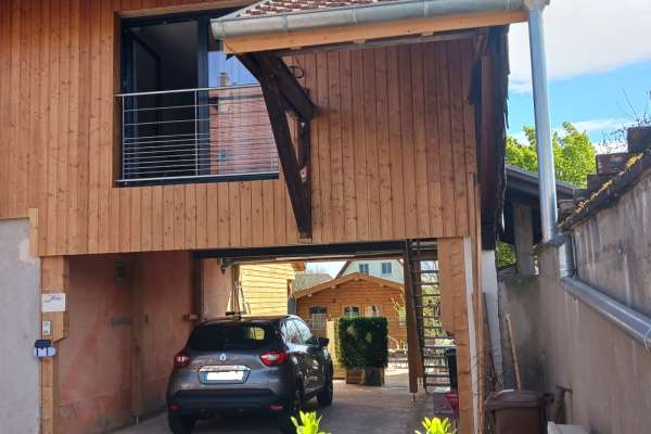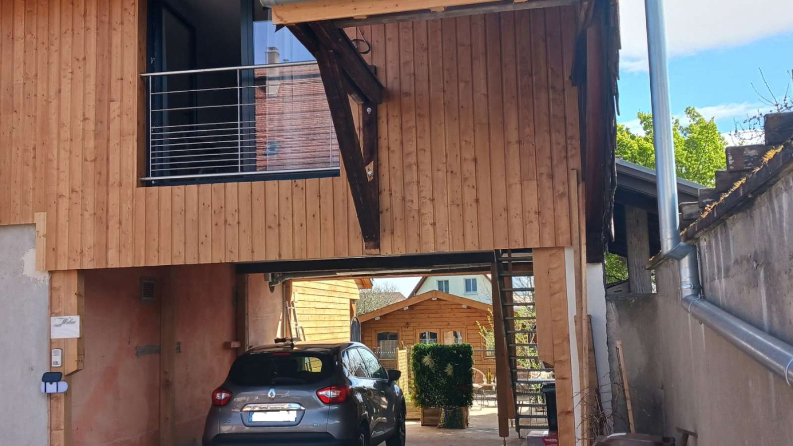Studio meublé neuf, 1 à 2 personnes, 28 m², au 1er étage, près du centre ville; cuisine équipée, coin télé et table à manger, salle de bains avec WC, grand lit tout confort, machine à laver le linge, télé, wifi gratuit, recharge électrique voiture. Espace extérieur privé au calme, de 18m2 au rez de chaussée pour détente et repas. Parking couvert pour la voiture et local fermé pour les vélos. Vue dégagée sur les Vosges.