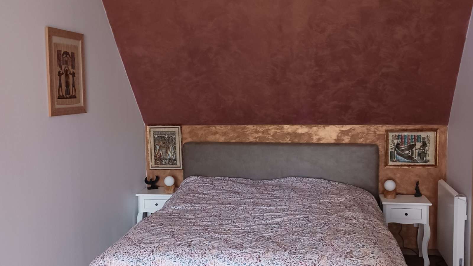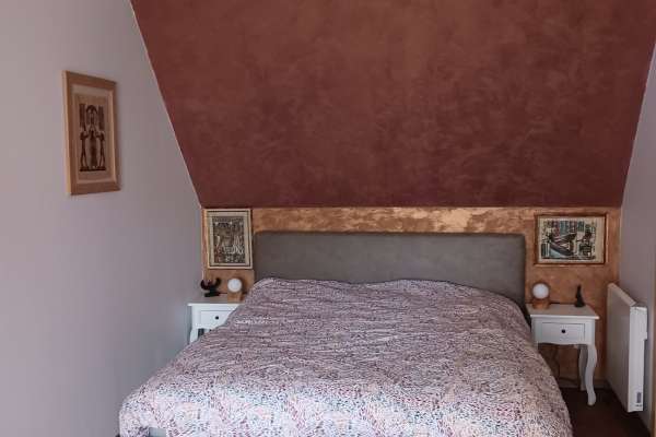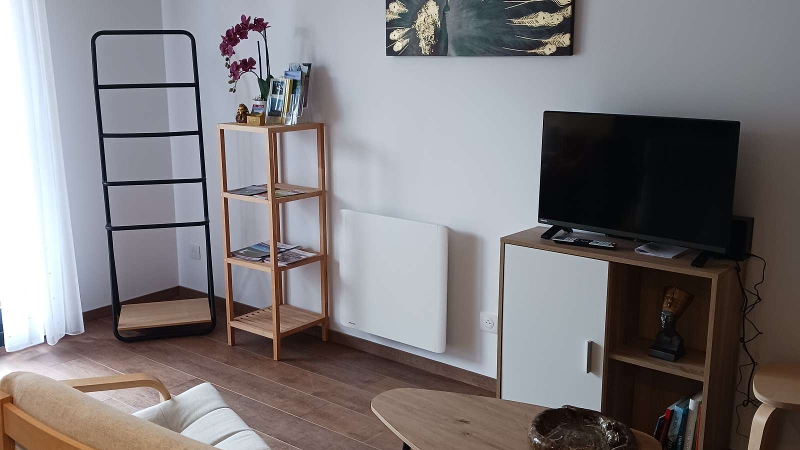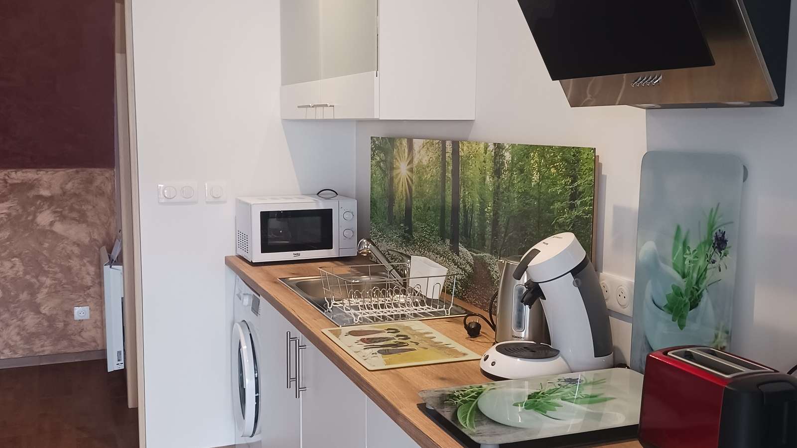 Studio meublé neuf, 1 à 2 personnes, 28 m², au 1er étage, près du centre ville; cuisine équipée, coin télé et table à manger, salle de bains avec WC, grand lit tout confort, machine à laver le linge, télé, wifi gratuit, recharge électrique voiture. Espace extérieur privé au calme, de 18m2 au rez de chaussée pour détente et repas. Parking couvert pour la voiture et local fermé pour les vélos. Vue dégagée sur les Vosges.