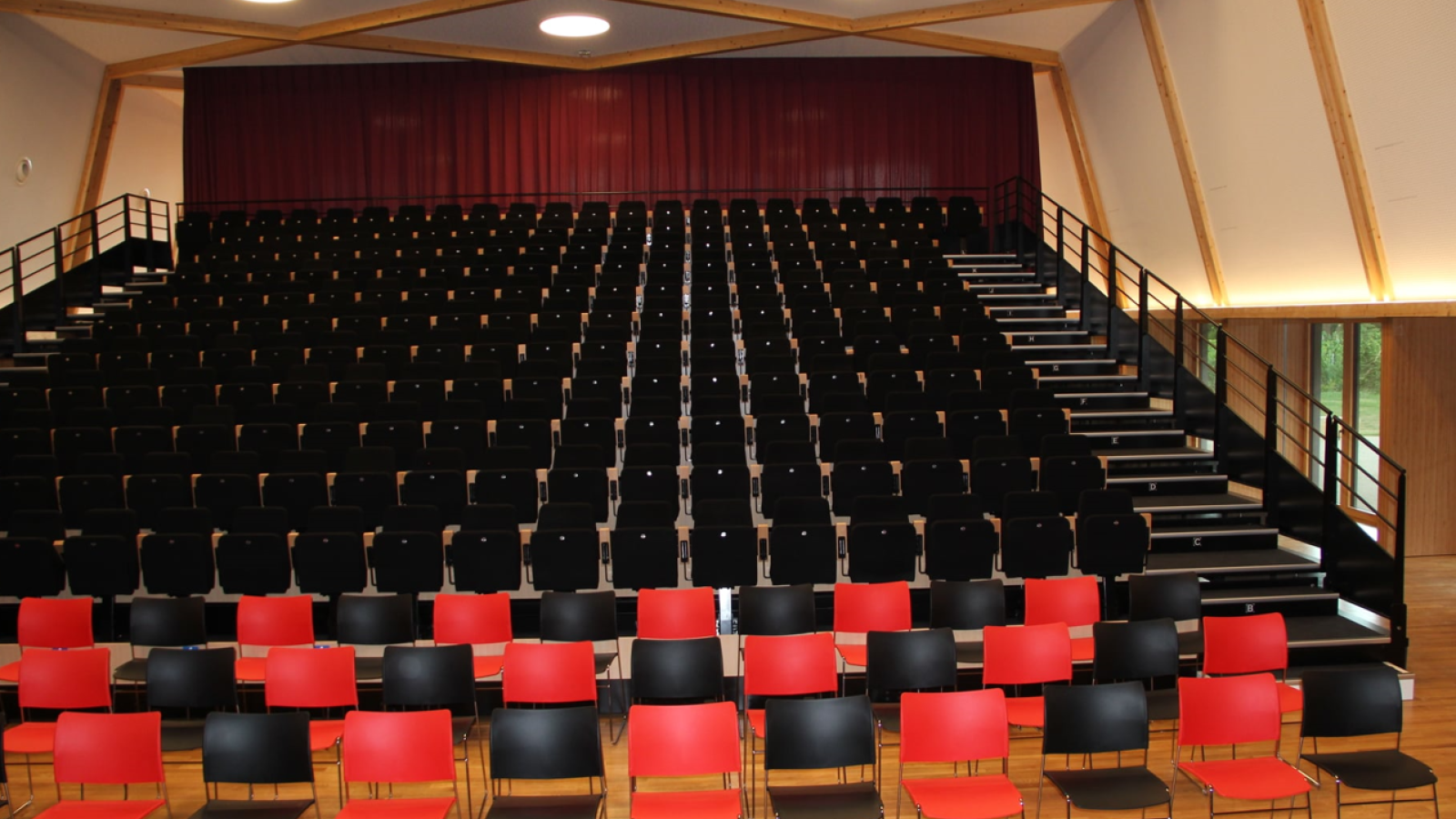 Grande salle : 473 m², séparable en deux parties au moyen d’un rideau et/ou de la tribune (161 m² + 312 m²)